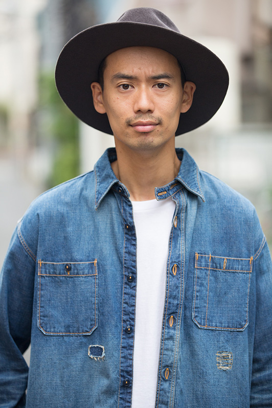 「シンプルなコーディネートですが、ビッグシルエットのシャツ、9分丈のパンツ、ブリムの広いハットなど、今旬なシルエットのアイテムでまとめてみました。インナーのTシャツは、フィット感が高く重ね着しやすいですね」